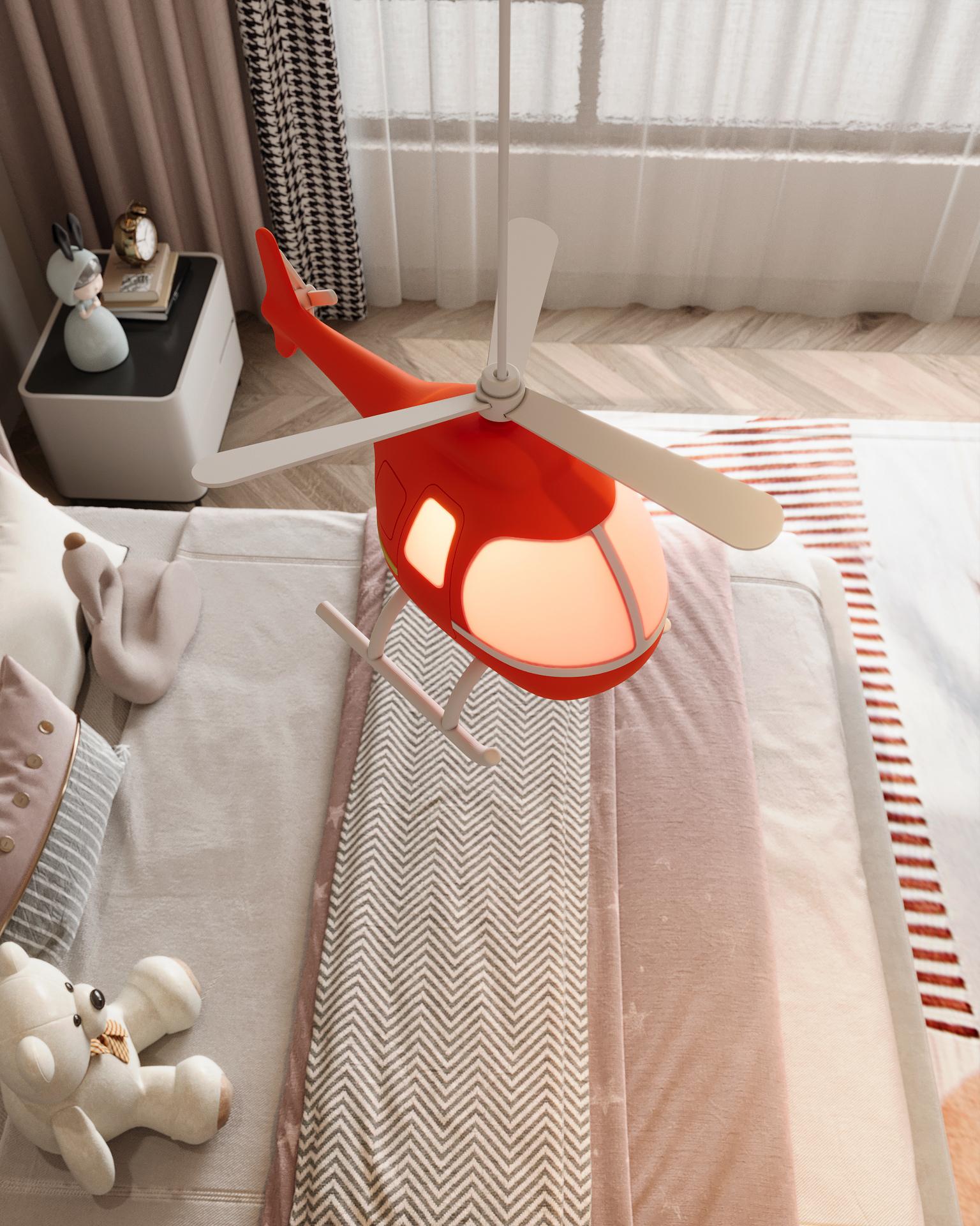 Helikopter formundaki sarkıt lamba, çocuk odaları için özel olarak tasarlanmış dekoratif bir aydınlatma ürünüdür. Sadece bir ışık kaynağı değil; aynı zamanda çocukların hayal gücünü destekleyen, odaya karakter kazandıran oyunlu bir tasarım sunar.
